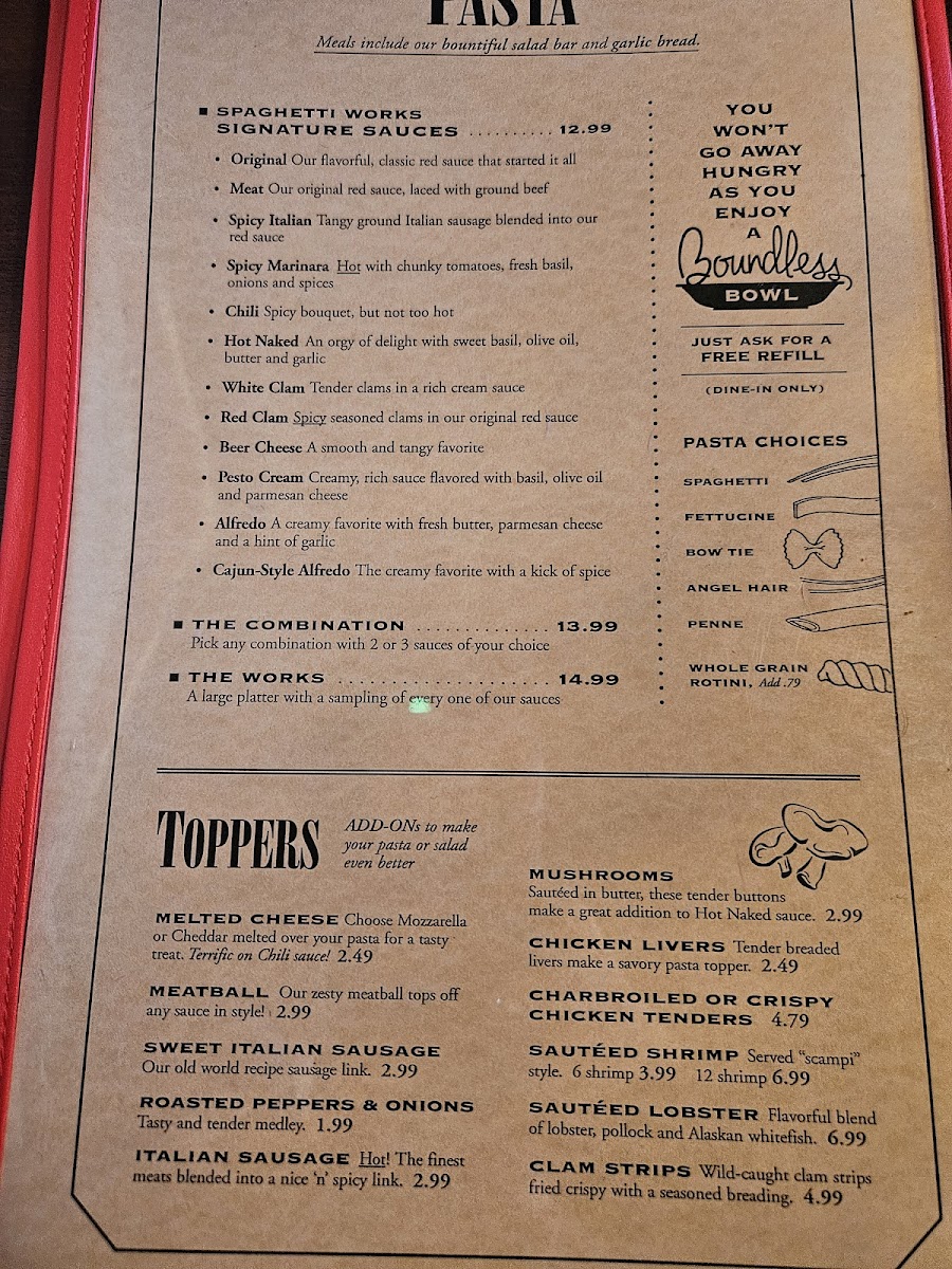 Welcome to Spaghetti Works, a culinary gem nestled in the heart of Omaha at 502 S 11th St. This beloved Italian eatery offers a warm, family-friendly atmosphere perfect for any occasion. Known for its boundless pasta bowls, Spaghetti Works allows you to indulge in a variety of delicious signature sauces, including the classic Meat Sauce and the zesty Spicy Marinara.